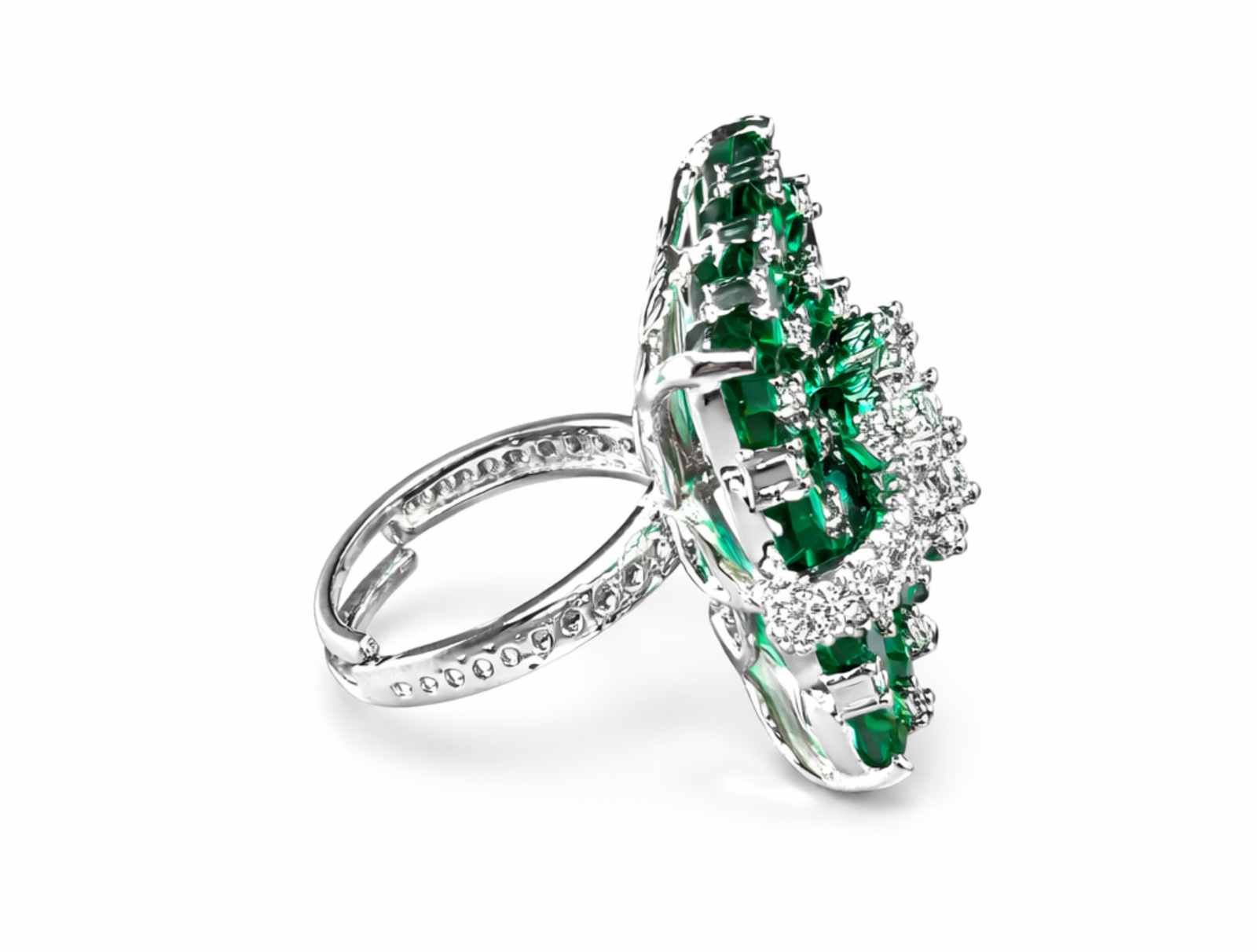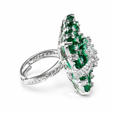 Crafted in a high-polish white metal setting, the contrast between the intense green gemstones and the radiant diamonds creates a luxurious, high-impact aesthetic. This ring is engineered for occasions that demand presence—where design precision meets expressive elegance.