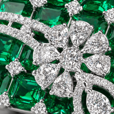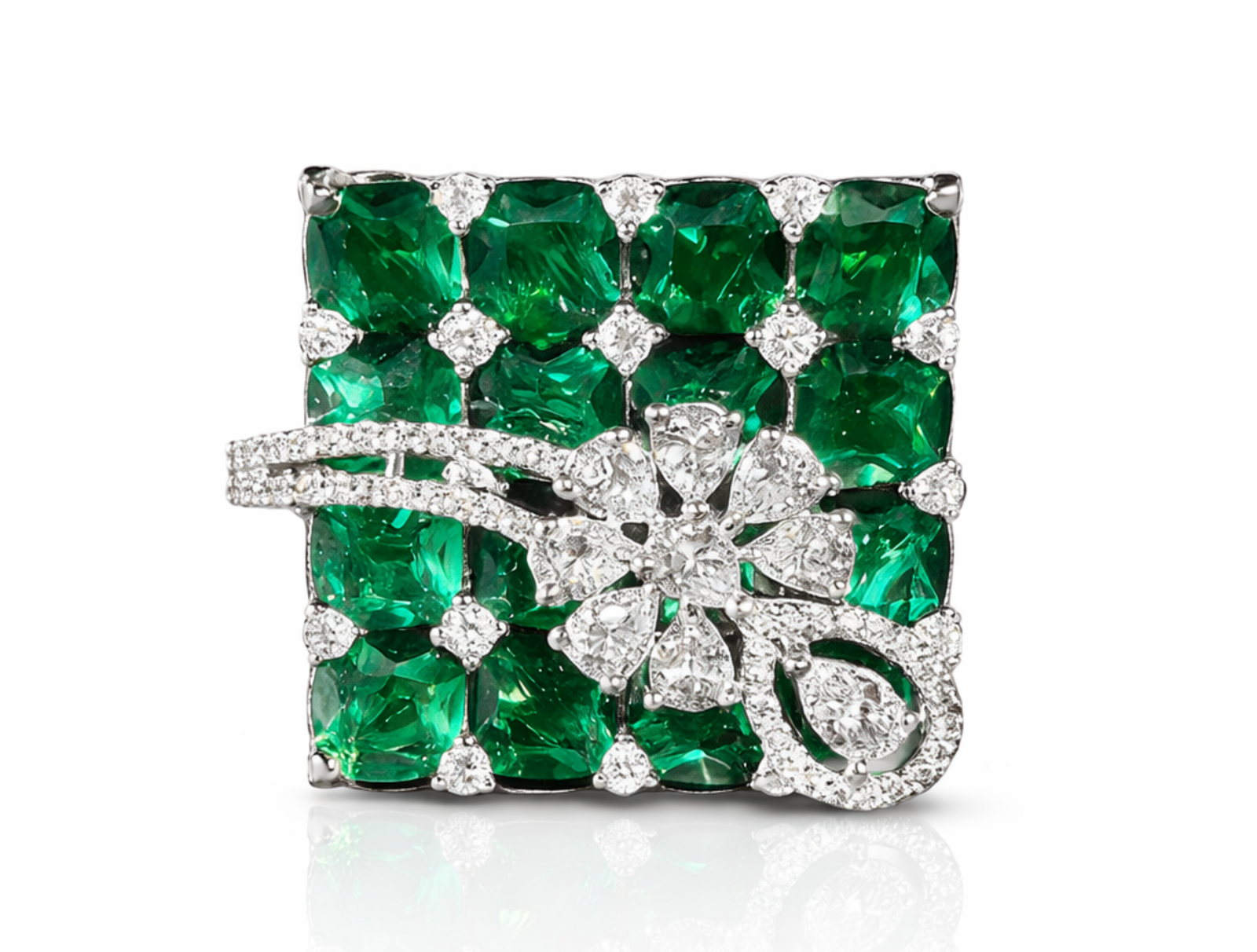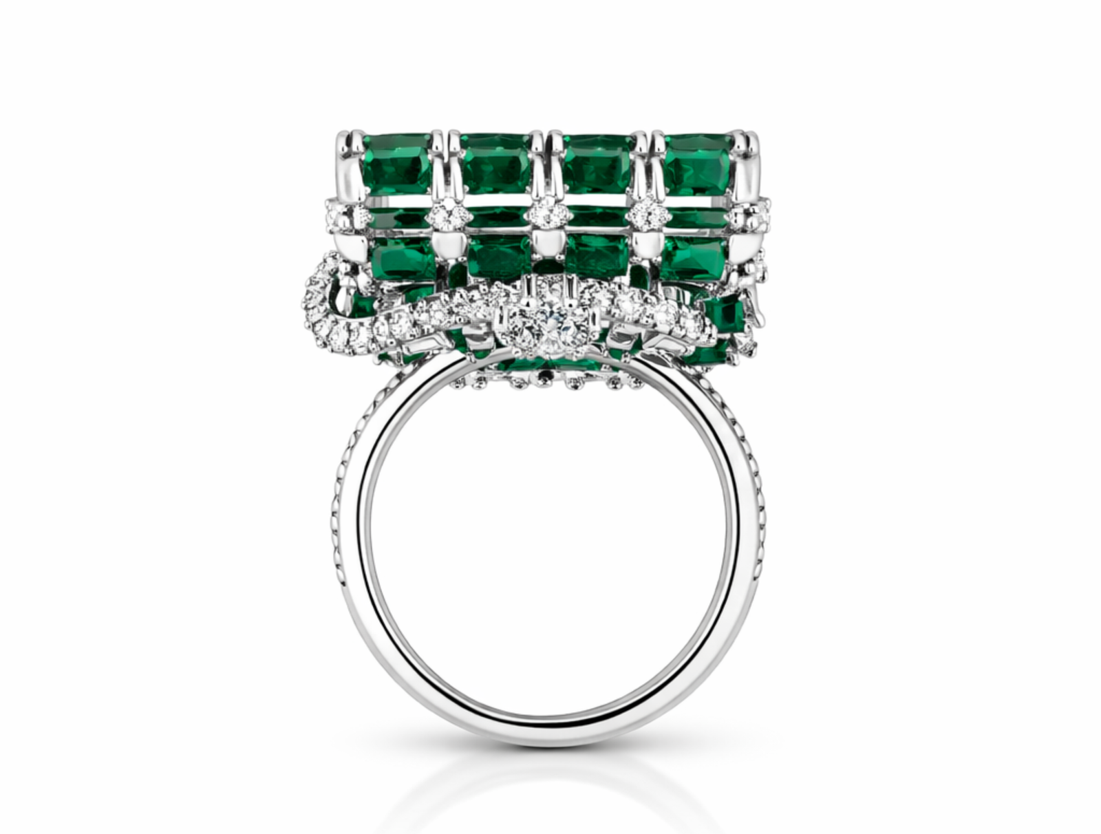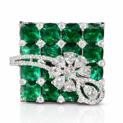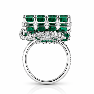 A bold interplay of color and brilliance, the Emerald Royale ring is designed as a statement of refined opulence. The centerpiece features a structured grid of vivid emerald-cut green stones, arranged in a seamless mosaic that delivers depth, richness, and a striking visual rhythm.