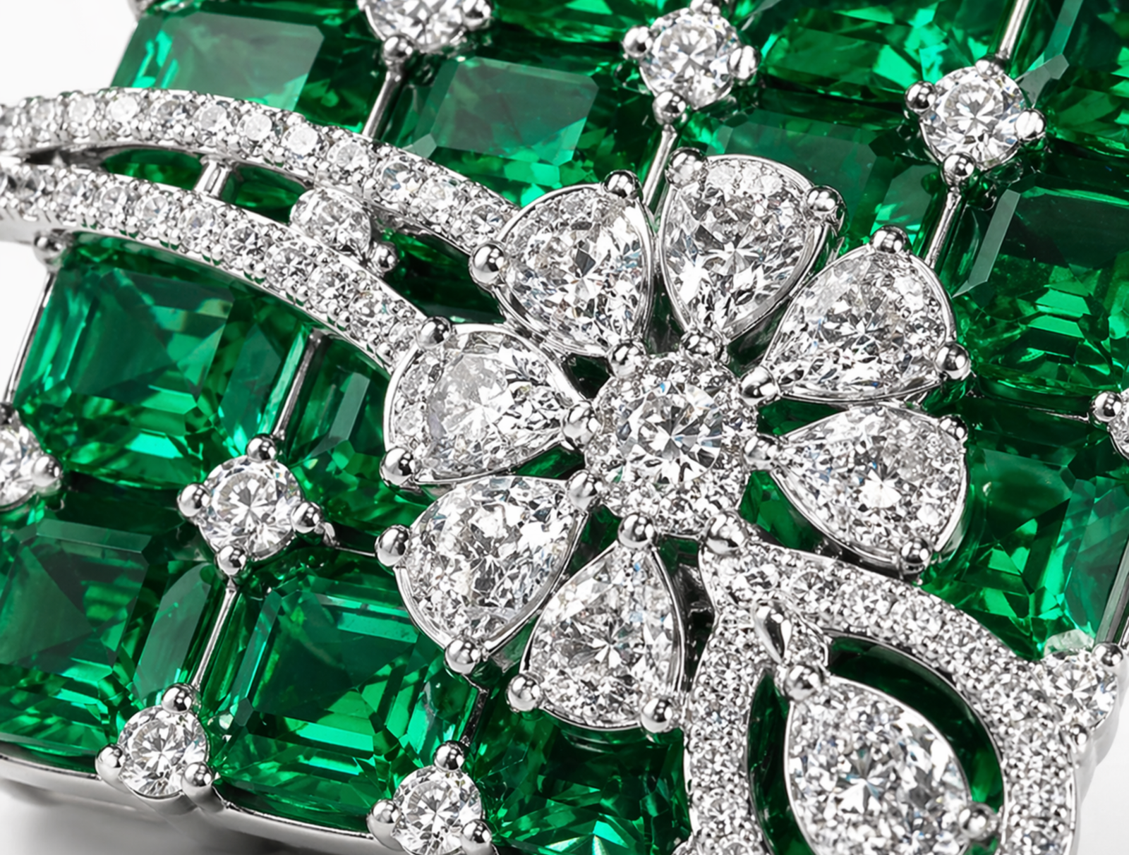 Layered above this geometric base is an intricate overlay of brilliant-cut diamonds, forming a floral-inspired cluster at the center. Delicate diamond-studded curves flow organically across the surface, softening the symmetry with a sense of movement and couture artistry.