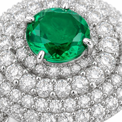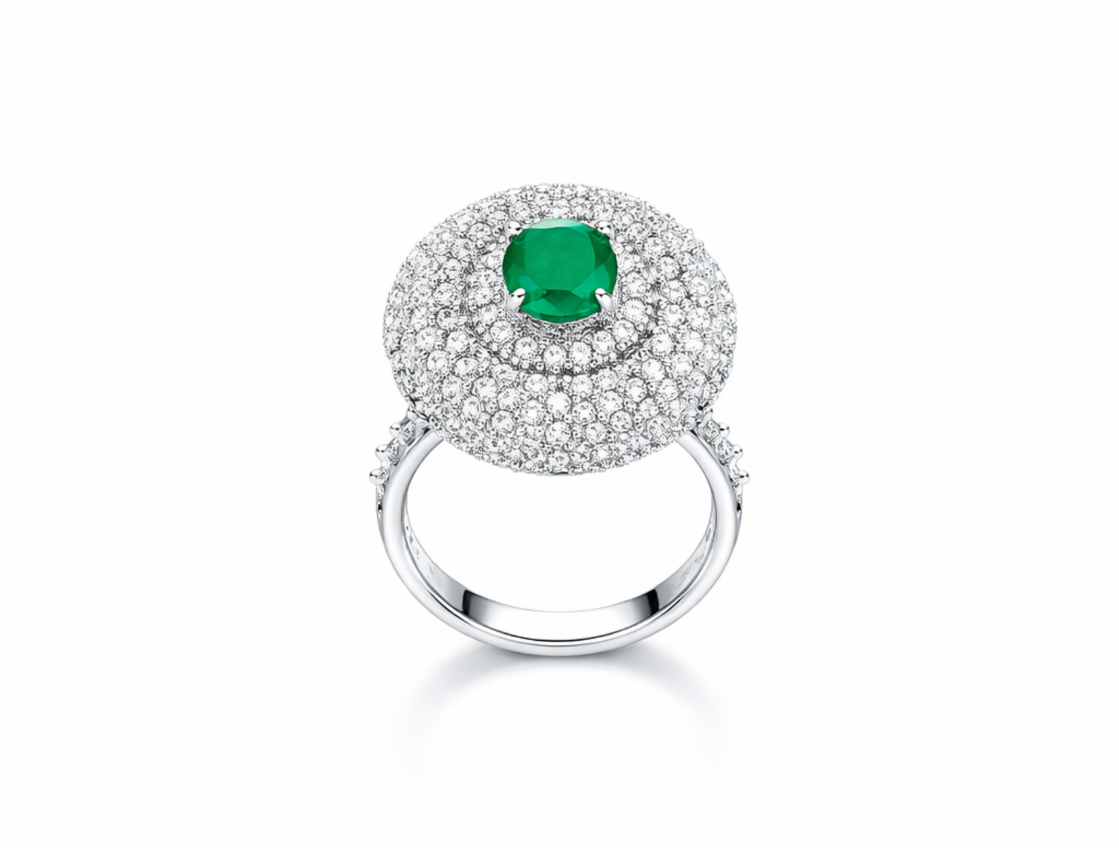 - Striking round-cut emerald centerpiece